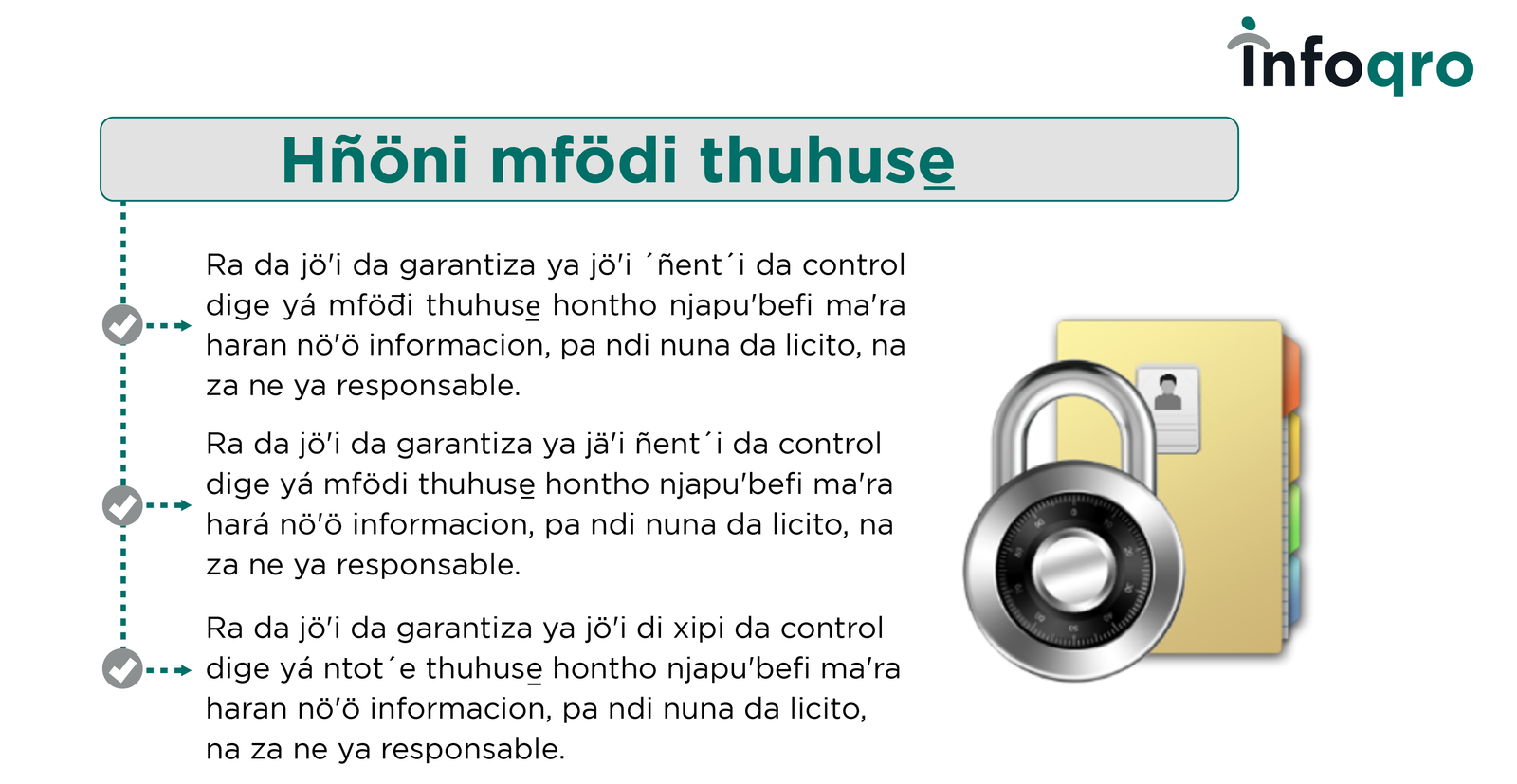 Pa nö’ö di ‘bui, rá mfats’i Mfödi ´muise xa reconocida jar xeni Nthuts’i ´ret´a ma rato ra Constitución ra nsu M’onda ne, ‘nehe, ja ma ximhai ‘bui ‘nar conjunto deni pa da t’ot’e ne garantizar nuna jar. Específicamente, jar Maxei, ‘bui ‘nar ley ja ra materia ne Infoqro ra institución encargada ya vigilar ne ya entes gubernamentales usen ya nt’ot’e lícita, responsable ne segura ya datos thuhuse ya trámites, ya ‘befi ne ya programas da ofrecen jar nthogi